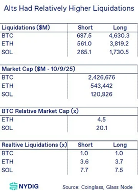 值得注意的是,ETH 和 SOL 的体量远小于 BTC。在暴跌之前,BTC 的市值约为 ETH 的 4.5 倍、SOL 的 20 倍。按体量调整后,ETH 的相对清算规模约为 BTC 的 3.7 倍,SOL 约为 BTC 的 7.6 倍。
